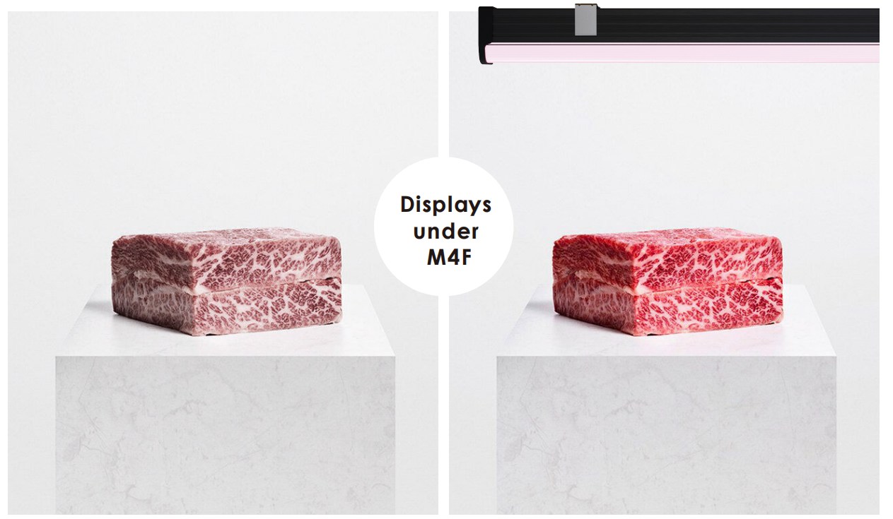 Basierend auf dem ultraschlanken Lichtband M4,Fanxstarhat die Lichtquelle angepasst, um ein Spektrum von 4000 K + 6500 K + Rot 660 nm speziell für die Fleischabteilung in Supermärkten zu erzeugen. Unter der Beleuchtung dieses Fleischlichtspektrums kann das Fleisch, das wir in den Supermärkten verkaufen, saftiger und frischer aussehen, wodurch der Fleischabsatz gesteigert wird.
