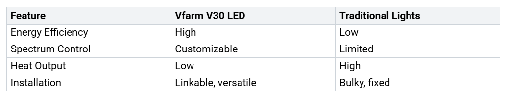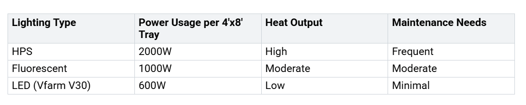 Energiekosten können über Erfolg oder Misserfolg Ihres Innengartens entscheiden. LED-Wachstumslampen zeichnen sich durch ihre bemerkenswerte Effizienz und ihren geringen Energieverbrauch aus. Wenn Sie von herkömmlichen Natriumdampf-Hochdrucklampen (HPS) oder Leuchtstofflampen auf LEDs umsteigen, können Sie Ihren Energieverbrauch um ein Vielfaches senken50-70 %. In der großflächigen vertikalen Landwirtschaft werden LEDs etwa verwendet600 W pro 4'x8' Tablett, während HPS-Systeme für die gleiche Fläche bis zu 2000 W benötigen. Dies führt zu erheblichen Energieeinsparungen und niedrigeren Stromrechnungen. LEDs geben außerdem weniger Wärme ab, was bedeutet, dass Sie weniger für die Kühlung aufwenden müssen und die Lampen näher an Ihren Pflanzen platzieren können. Der integrierte Treiber und das wasserdichte IP65-Design des Vfarm V30 sorgen für zuverlässige Leistung in anspruchsvollen Umgebungen und senken so die Wartungs- und Betriebskosten weiter.