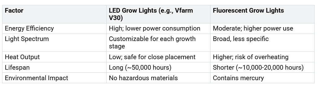 Wenn Sie LED-Wachstumslampen mit Leuchtstofflampen vergleichen, erkennen Sie klare VorteileEnergieeffizienz, Pflanzengesundheit und Pflege. LEDs wie die FANXSTAR Vfarm V30 bieten anpassbare Lichtspektren, längere Lebensdauer und einen sichereren Betrieb. Leuchtstofflampen wie T5-Röhren verbrauchen mehr Energie, erzeugen mehr Wärme und haben eine kürzere Lebensdauer. Sie enthalten auch gefährliche Stoffe wie Quecksilber, die einer besonderen Entsorgung bedürfen.
