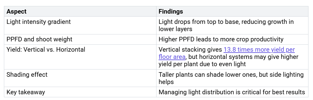Sie sehen klare Beweise aus wissenschaftlichen Studien, dass vertikale Wachstumslampen das Pflanzenwachstum und den Ertrag verändern können. Forscher haben gemessen, wie sich die Lichtintensität von der Spitze zur Basis vertikaler Säulen ändert. Sie fanden heraus, dass die unteren Schichten oft weniger Licht erhalten, was das Wachstum einschränken kann. Wenn Sie jedoch Side-on- oder Interlighting-Strategien verwenden, können Sie die Belichtung aller Ebenen erhöhen und die Produktivität steigern.